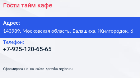 Гости, тайм-кафе по адресу 143989, Московская область, Балашиха, Жилгородок, 6 в дальнейшем Организация, размещена в следующих категориях: