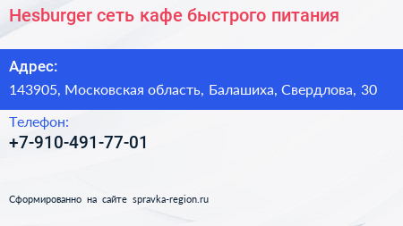 Hesburger, сеть кафе быстрого питания по адресу 143905, Московская область, Балашиха, Свердлова, 30 в дальнейшем Организация, размещена в следующих категориях:
