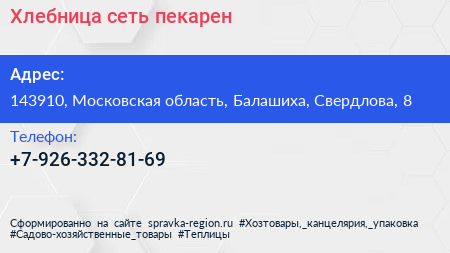 Хлебница, сеть пекарен по адресу 143910, Московская область, Балашиха, Свердлова, 8 в дальнейшем Организация, размещена в следующих категориях:
