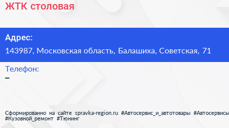 ЖТК, столовая по адресу 143987, Московская область, Балашиха, Советская, 71 в дальнейшем Организация, размещена в следующих категориях: