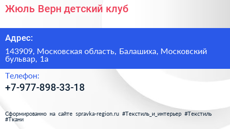 Жюль Верн, детский клуб по адресу 143909, Московская область, Балашиха, Московский бульвар, 1а в дальнейшем Организация, размещена в следующих категориях: