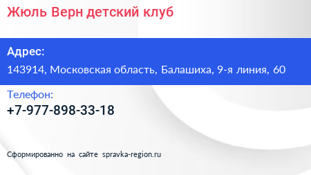 Жюль Верн, детский клуб по адресу 143914, Московская область, Балашиха, 9-я линия, 60 в дальнейшем Организация, размещена в следующих категориях: