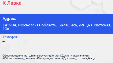 К-Лавка по адресу 143904, Московская область, Балашиха, улица Советская, 10а в дальнейшем Организация, размещена в следующих категориях: