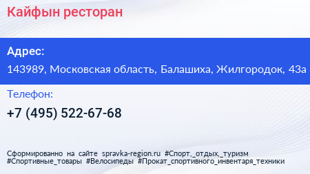 Кайфын, ресторан по адресу 143989, Московская область, Балашиха, Жилгородок, 43а в дальнейшем Организация, размещена в следующих категориях: