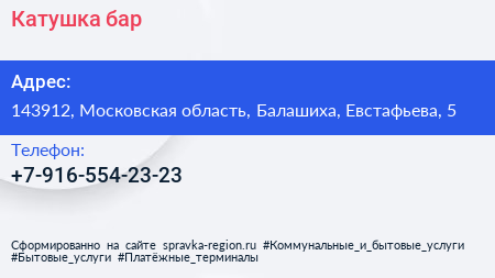 Катушка, бар по адресу 143912, Московская область, Балашиха, Евстафьева, 5 в дальнейшем Организация, размещена в следующих категориях:
