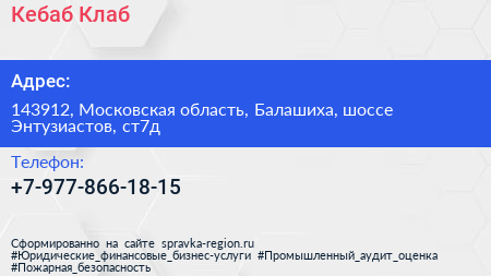 Кебаб Клаб по адресу 143912, Московская область, Балашиха, шоссе Энтузиастов, ст7д в дальнейшем Организация, размещена в следующих категориях: