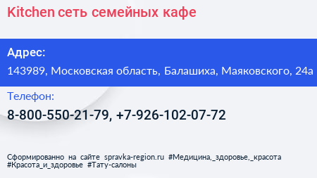 Kitchen, сеть семейных кафе по адресу 143989, Московская область, Балашиха, Маяковского, 24а в дальнейшем Организация, размещена в следующих категориях: