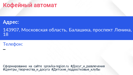 Кофейный автомат по адресу 143907, Московская область, Балашиха, проспект Ленина, 18 в дальнейшем Организация, размещена в следующих категориях: