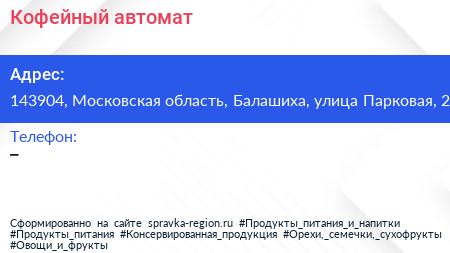 Кофейный автомат по адресу 143904, Московская область, Балашиха, улица Парковая, 2 в дальнейшем Организация, размещена в следующих категориях: