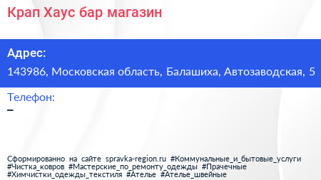 Крап Хаус, бар-магазин по адресу 143986, Московская область, Балашиха, Автозаводская, 5 в дальнейшем Организация, размещена в следующих категориях: