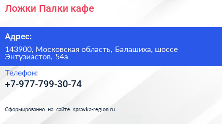 Ложки-Палки, кафе по адресу 143900, Московская область, Балашиха, шоссе Энтузиастов, 54а в дальнейшем Организация, размещена в следующих категориях: