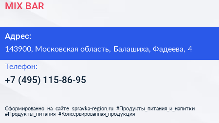 MIX BAR по адресу 143900, Московская область, Балашиха, Фадеева, 4 в дальнейшем Организация, размещена в следующих категориях:
