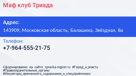Маф-клуб Триада по адресу 143909, Московская область, Балашиха, Звёздная, 8а в дальнейшем Организация, размещена в следующих категориях: