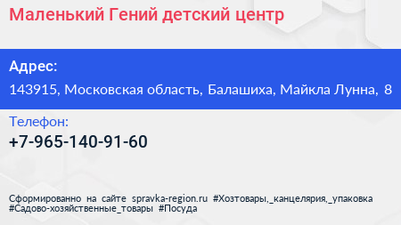 Маленький Гений, детский центр по адресу 143915, Московская область, Балашиха, Майкла Лунна, 8 в дальнейшем Организация, размещена в следующих категориях: