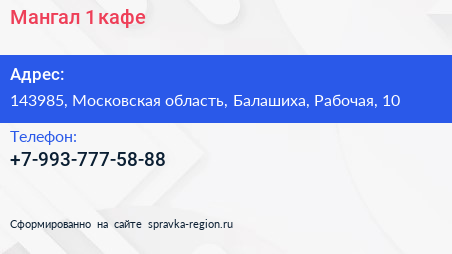 Мангал №1, кафе по адресу 143985, Московская область, Балашиха, Рабочая, 10 в дальнейшем Организация, размещена в следующих категориях: