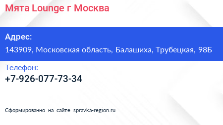 Мята Lounge, г. Москва по адресу 143909, Московская область, Балашиха, Трубецкая, 98Б в дальнейшем Организация, размещена в следующих категориях: