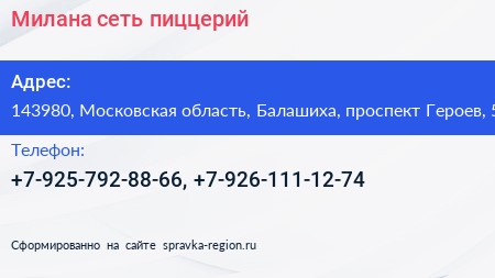 Милана, сеть пиццерий по адресу 143980, Московская область, Балашиха, проспект Героев, 5 в дальнейшем Организация, размещена в следующих категориях:
