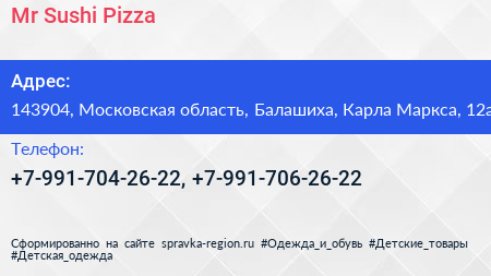 Mr. Sushi Pizza по адресу 143904, Московская область, Балашиха, Карла Маркса, 12а в дальнейшем Организация, размещена в следующих категориях: