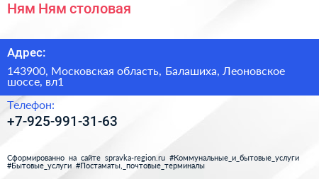 Ням-Ням, столовая по адресу 143900, Московская область, Балашиха, Леоновское шоссе, вл1 в дальнейшем Организация, размещена в следующих категориях: