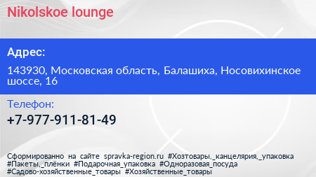 Nikolskoe lounge по адресу 143930, Московская область, Балашиха, Носовихинское шоссе, 16 в дальнейшем Организация, размещена в следующих категориях: