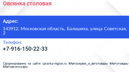 Овсянка, столовая по адресу 143912, Московская область, Балашиха, улица Советская, 2 в дальнейшем Организация, размещена в следующих категориях:
