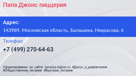 Папа Джонс, пиццерия по адресу 143989, Московская область, Балашиха, Некрасова, 6 в дальнейшем Организация, размещена в следующих категориях: