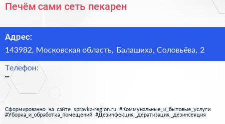 Печём сами, сеть пекарен по адресу 143982, Московская область, Балашиха, Соловьёва, 2 в дальнейшем Организация, размещена в следующих категориях: