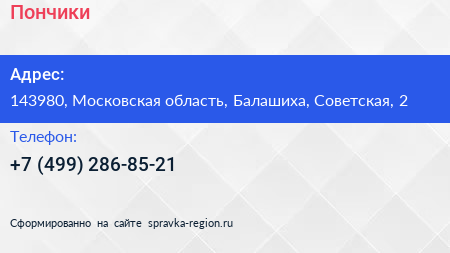 Пончики! по адресу 143980, Московская область, Балашиха, Советская, 2 в дальнейшем Организация, размещена в следующих категориях: