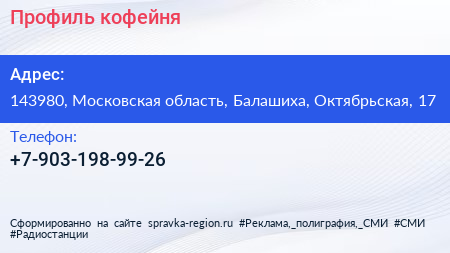 Профиль, кофейня по адресу 143980, Московская область, Балашиха, Октябрьская, 17 в дальнейшем Организация, размещена в следующих категориях: