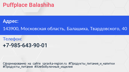 Puffplace Balashiha по адресу 143900, Московская область, Балашиха, Твардовского, 40 в дальнейшем Организация, размещена в следующих категориях: