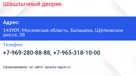 Шашлычный дворик по адресу 143909, Московская область, Балашиха, Щёлковское шоссе, 28 в дальнейшем Организация, размещена в следующих категориях: