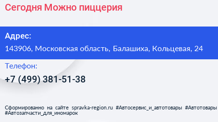 Сегодня Можно, пиццерия по адресу 143906, Московская область, Балашиха, Кольцевая, 24 в дальнейшем Организация, размещена в следующих категориях: