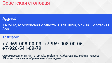 Советская столовая по адресу 143902, Московская область, Балашиха, улица Советская, 36а в дальнейшем Организация, размещена в следующих категориях: