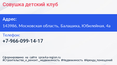Совушка, детский клуб по адресу 143986, Московская область, Балашиха, Юбилейная, 4а в дальнейшем Организация, размещена в следующих категориях:
