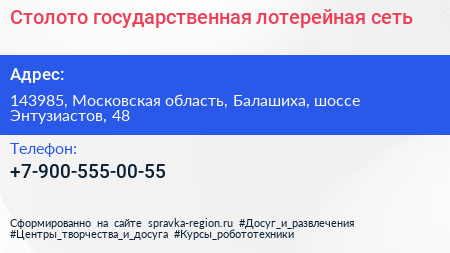 Столото, государственная лотерейная сеть по адресу 143985, Московская область, Балашиха, шоссе Энтузиастов, 48 в дальнейшем Организация, размещена в следующих категориях: