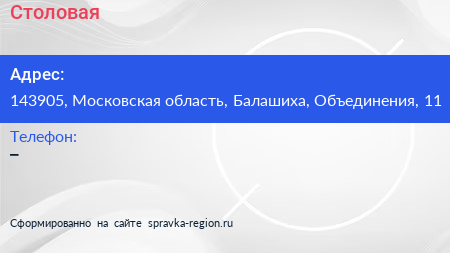 Столовая по адресу 143905, Московская область, Балашиха, Объединения, 11 в дальнейшем Организация, размещена в следующих категориях: