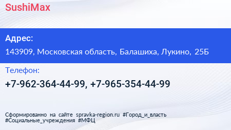 SushiMax по адресу 143909, Московская область, Балашиха, Лукино, 25Б в дальнейшем Организация, размещена в следующих категориях: