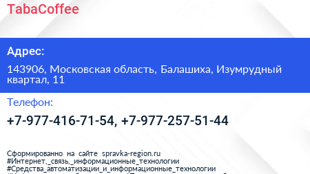 TabaCoffee по адресу 143906, Московская область, Балашиха, Изумрудный квартал, 11 в дальнейшем Организация, размещена в следующих категориях: