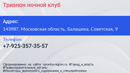 Трианон, ночной клуб по адресу 143987, Московская область, Балашиха, Советская, 9 в дальнейшем Организация, размещена в следующих категориях: