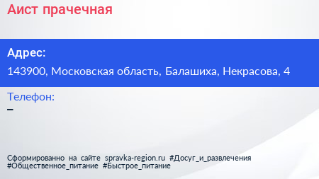 Аист, прачечная по адресу 143900, Московская область, Балашиха, Некрасова, 4 в дальнейшем Организация, размещена в следующих категориях:
