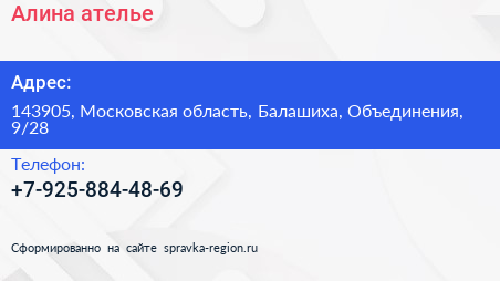 Алина, ателье по адресу 143905, Московская область, Балашиха, Объединения, 9/28 в дальнейшем Организация, размещена в следующих категориях: