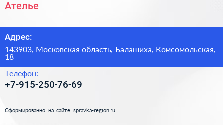 Ателье по адресу 143903, Московская область, Балашиха, Комсомольская, 18 в дальнейшем Организация, размещена в следующих категориях: