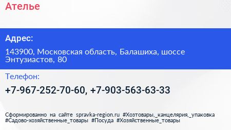 Ателье по адресу 143900, Московская область, Балашиха, шоссе Энтузиастов, 80 в дальнейшем Организация, размещена в следующих категориях: