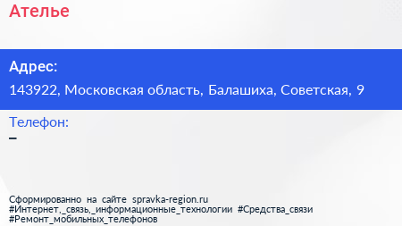 Ателье по адресу 143922, Московская область, Балашиха, Советская, 9 в дальнейшем Организация, размещена в следующих категориях: