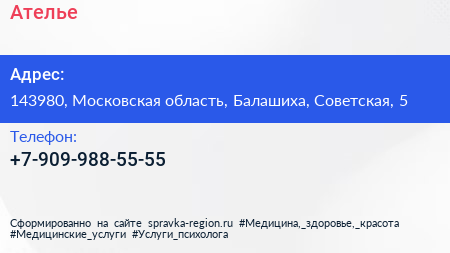 Ателье по адресу 143980, Московская область, Балашиха, Советская, 5 в дальнейшем Организация, размещена в следующих категориях: