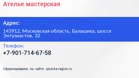 Ателье-мастерская по адресу 143912, Московская область, Балашиха, шоссе Энтузиастов, 32 в дальнейшем Организация, размещена в следующих категориях: