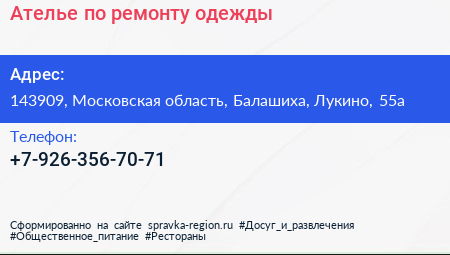 Ателье по ремонту одежды по адресу 143909, Московская область, Балашиха, Лукино, 55а в дальнейшем Организация, размещена в следующих категориях: