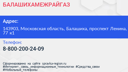 БАЛАШИХАМЕЖРАЙГАЗ по адресу 143903, Московская область, Балашиха, проспект Ленина, 77 к1 в дальнейшем Организация, размещена в следующих категориях: