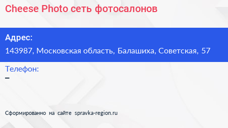 Cheese-Photo, сеть фотосалонов по адресу 143987, Московская область, Балашиха, Советская, 57 в дальнейшем Организация, размещена в следующих категориях: