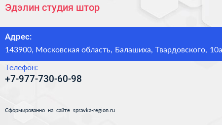 Эдэлин, студия штор по адресу 143900, Московская область, Балашиха, Твардовского, 10а в дальнейшем Организация, размещена в следующих категориях:
